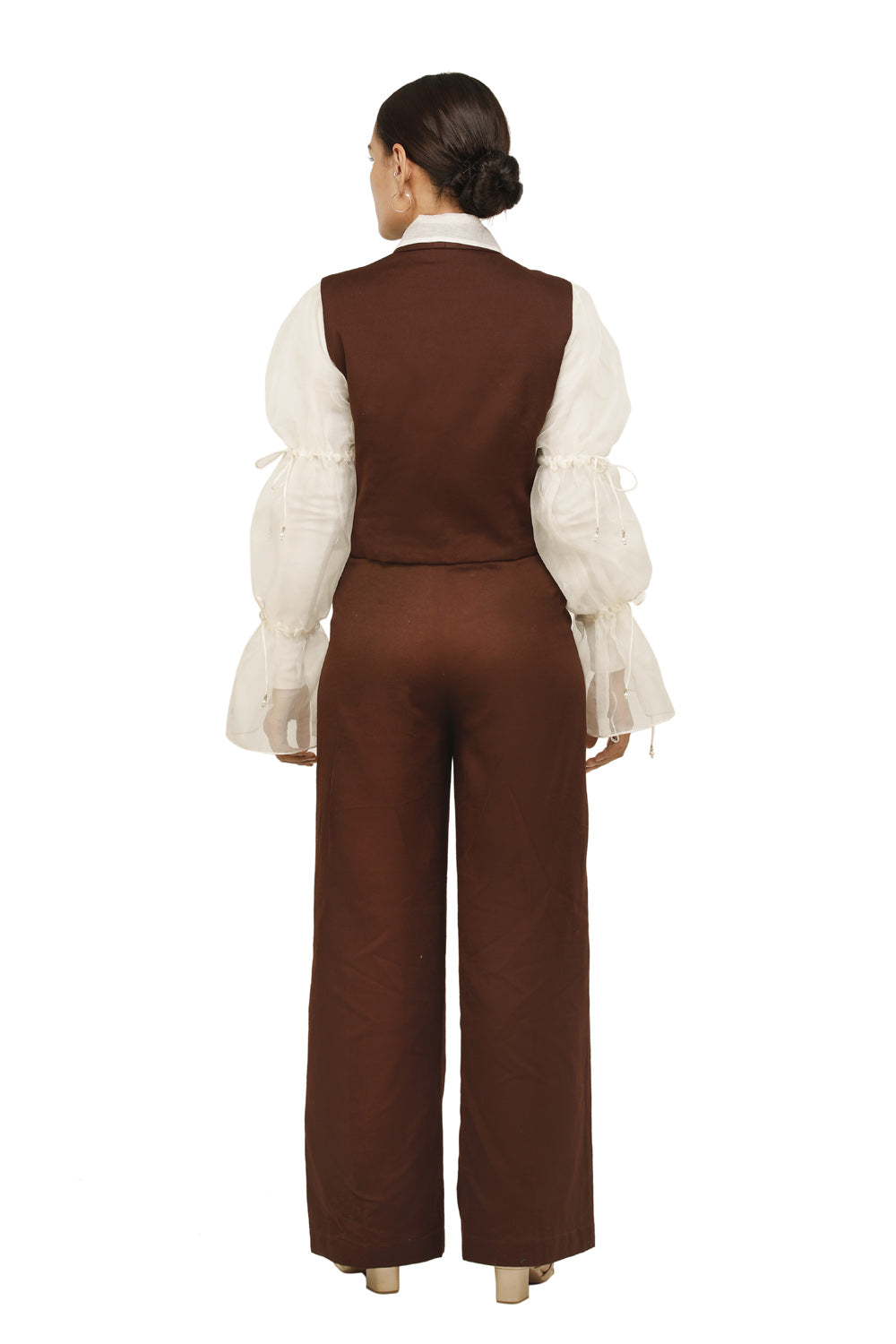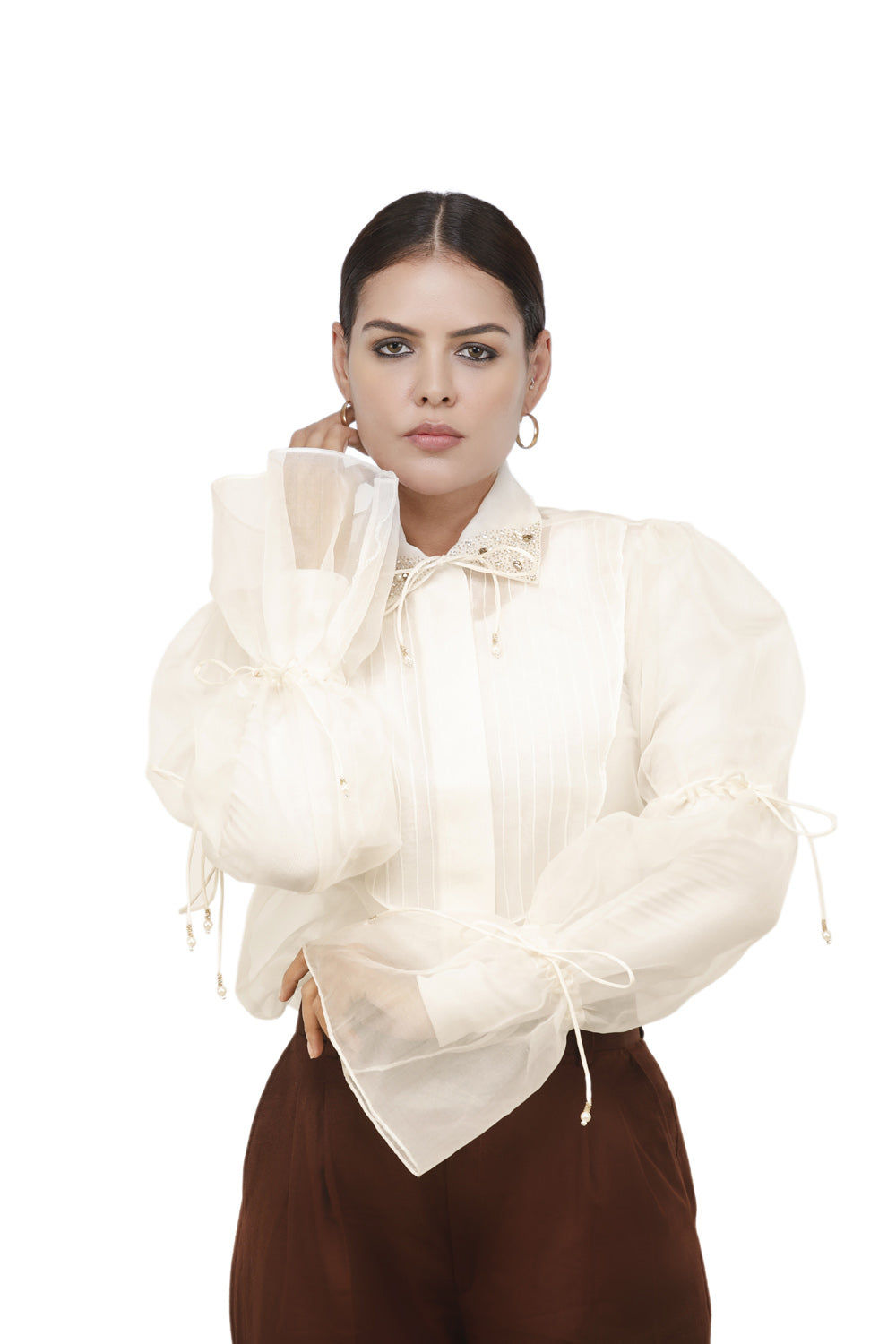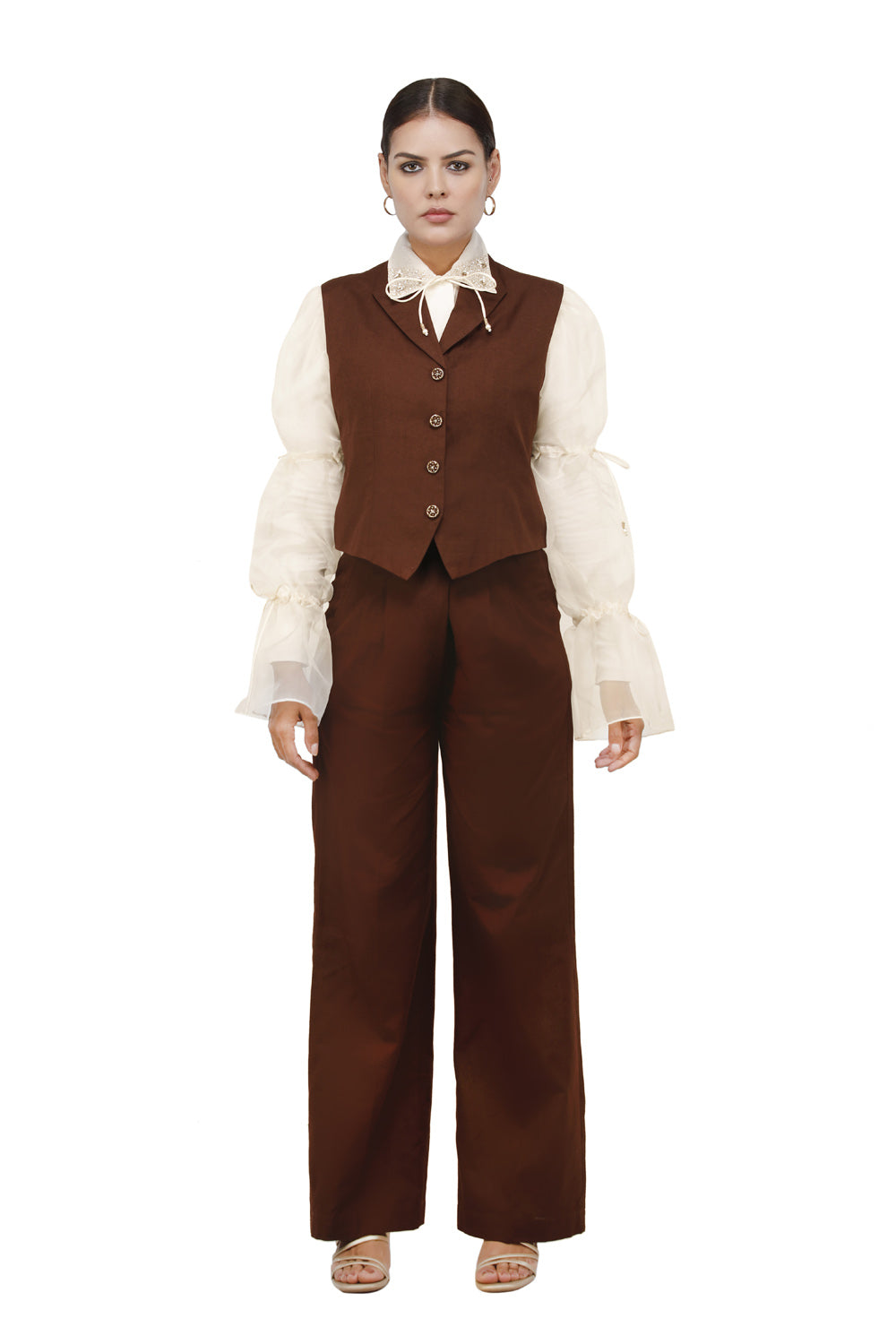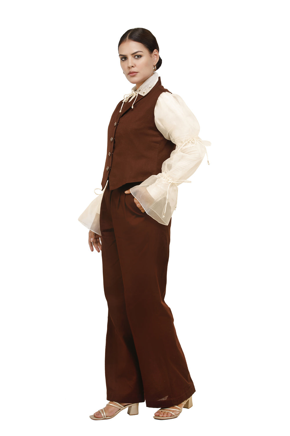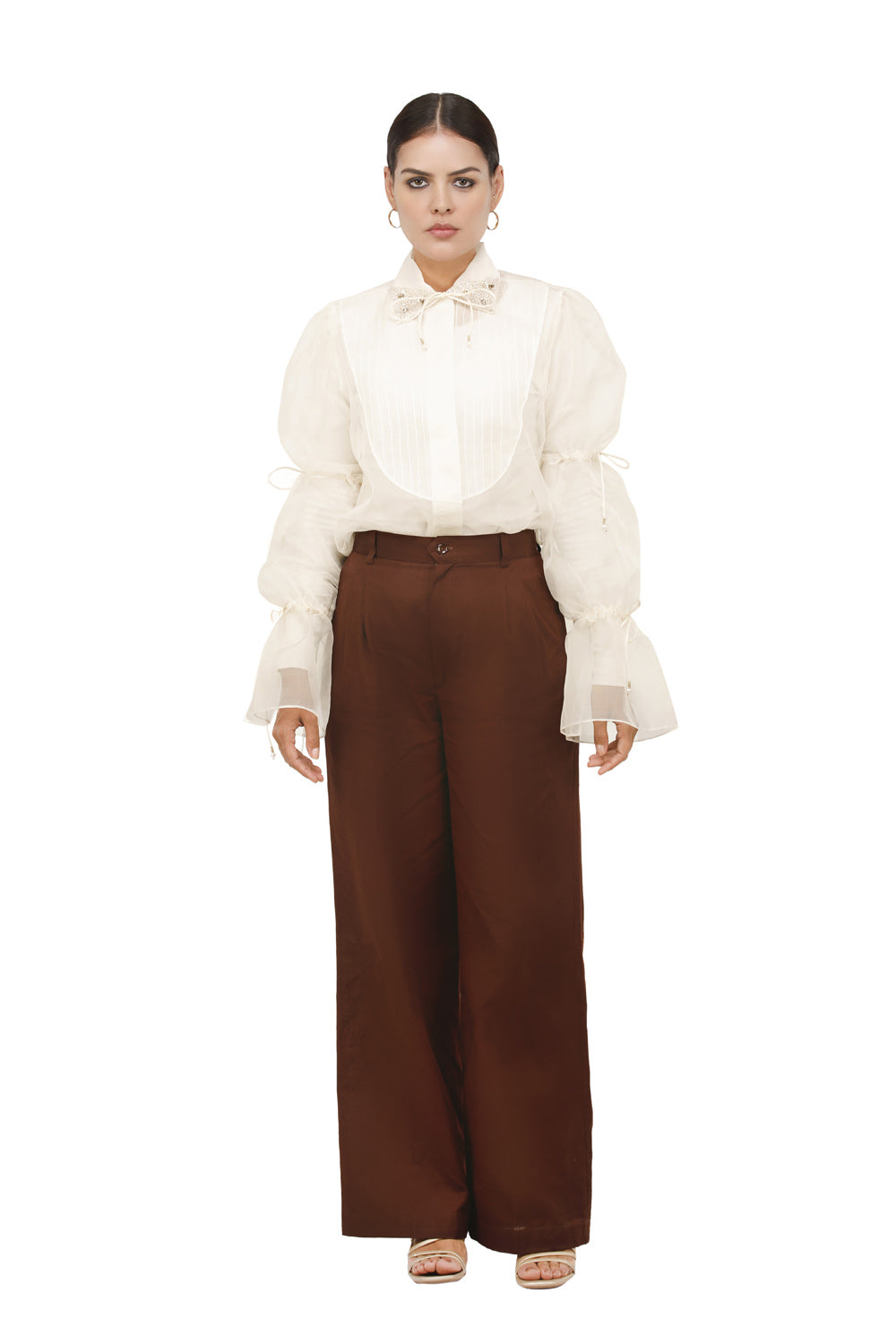 الوصف : قميص بياقة مطرزة وأكمام من الأورجانزا المنتفخة مع أربطة مع بنطلون واسع الساق وسترة